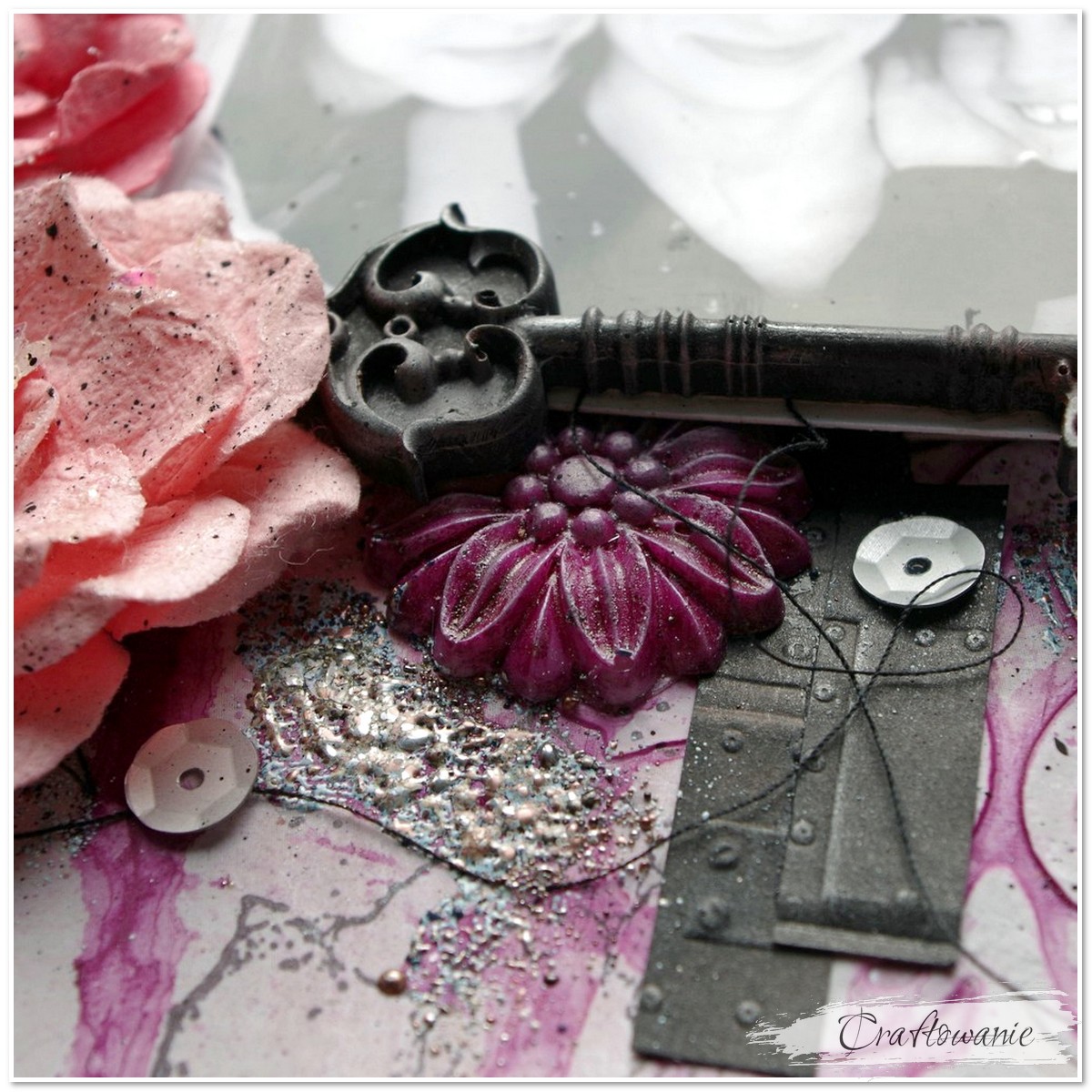 Jest w nim wszystko co lubię - przede wszystkim piękne zdjęcie, ale też trochę mediów (pasta strukturalna, mgiełka, farba akrylowa, puder do embossingu, woski) i stemplowanie. Jednak to papier, jako baza całej pracy, odgrywa zasadniczą rolę. Tutaj wykorzystałam arkusz z kolekcji "Day by Day" od Mintay Papers.