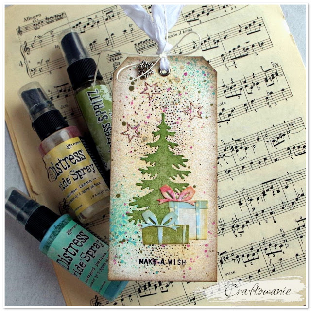 Papier, który idealnie sprawdza mi się do takich prac, to papier o dość grubej gramaturze, przeznaczony do malowania m.in. farbami akrylowymi. Najważniejsze, że jest odporny i wytrzymały na przyjmowanie sporej ilości mokrych preparatów. W pierwszym kroku na kartonik położyłam choinkę - maskę, która idealnie pasuje do kształtów z szablonu. Wybrane miejsce zostało zakryte, a zatem pozostałą powierzchnię mogłam popryskać mgiełkami. Starałam się to robić bardzo delikatnie, żeby zostawić wyraźne plamy i chlapnięcia, a nie dążyć do jednolitego tła. Po zdjęciu maski, przyłożyłam szablon i kształt choinki starannie wytuszowałam wykorzystując do tego szczoteczkę. Dodatkowo kolorowałam tę choinkę kredkami akwarelowymi, a na koniec dodałam czerwone i przezroczyste akcenty, które mają imitować bombki.